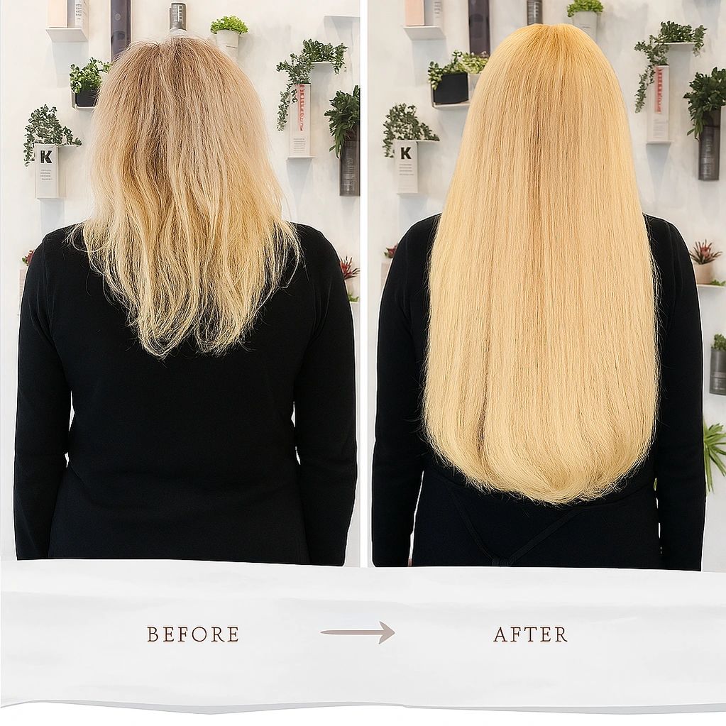22 Inch Nano Tip Extensions, 100 Grams of Luxurious Length & Fullness. These luxury extensions were custom blended using different weft shades to create a seamless, natural looking colour so no dye was needed.